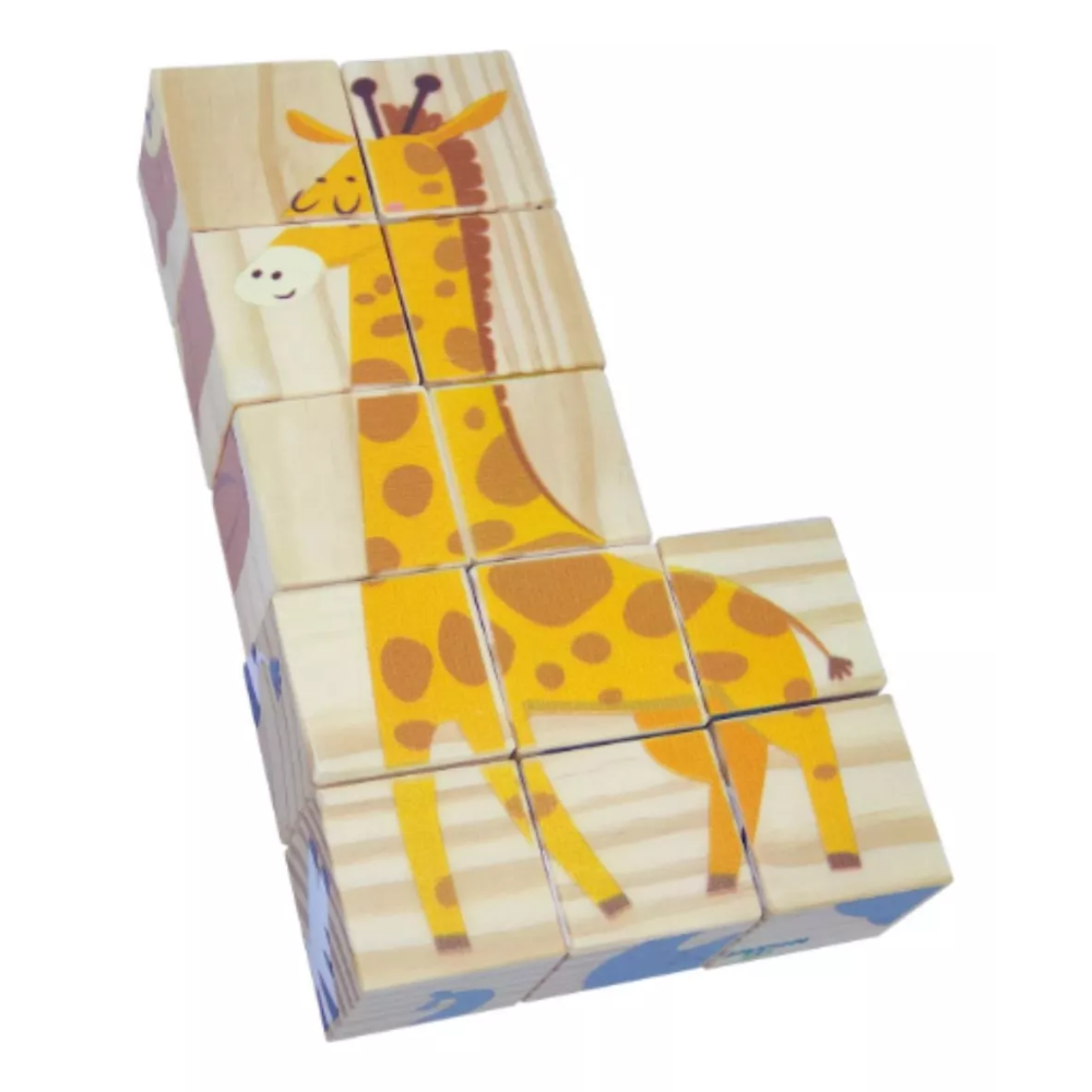 É um conjunto de 12 cubos de madeira com 12 diferentes desenhos de Animais da Selva.