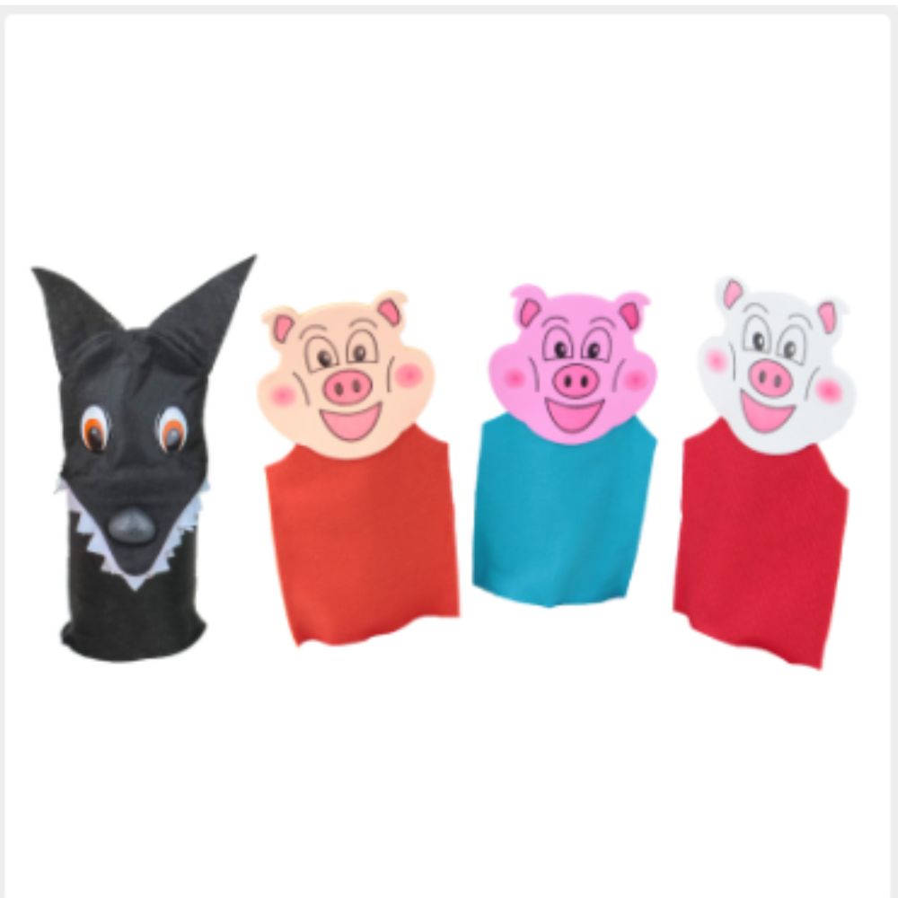 Kit composto por 4 personagens caracterizados. Confeccionados em feltro e EVA três porquinhos e 1 lobo. Personagens: 3 porquinhos e 1 lobo. Medidas variando entre 32 a 36 cm de altura. Embalagem: saco plástico com solapa colorida em papel couchê.